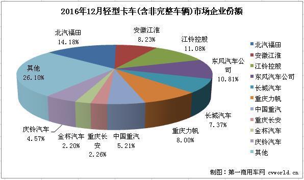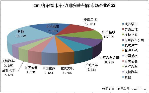 據(jù)中國汽車工業(yè)協(xié)會統(tǒng)計,2016年國內輕型卡車(含非完整車輛)累計銷售1539820輛,同比累計下降1.20%。累計銷量前十企業(yè)共銷售1173797輛,占據(jù)整個輕型卡車(含非完整車輛)市場總銷量76.23%的份額。從增幅看,銷量前十企業(yè)6增4降,累計增幅最高的是中國重汽,達到35.59%,安徽江淮和重慶長安兩家企業(yè)的增幅也超過10%;降幅最大的是金杯汽車,達到59.08%。